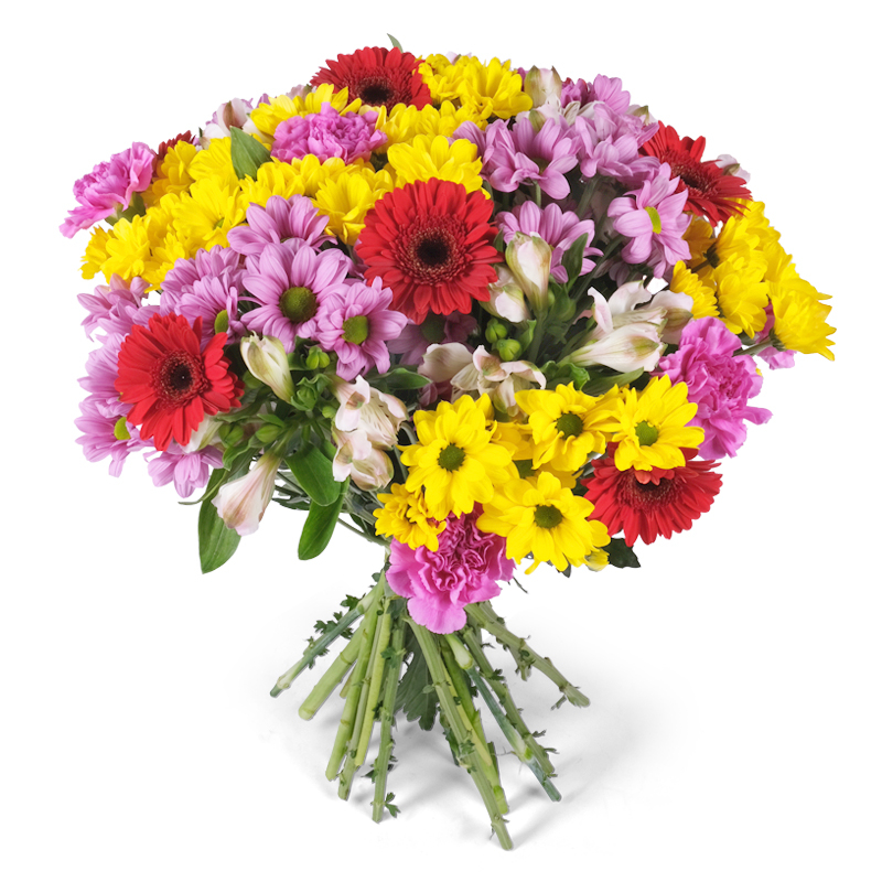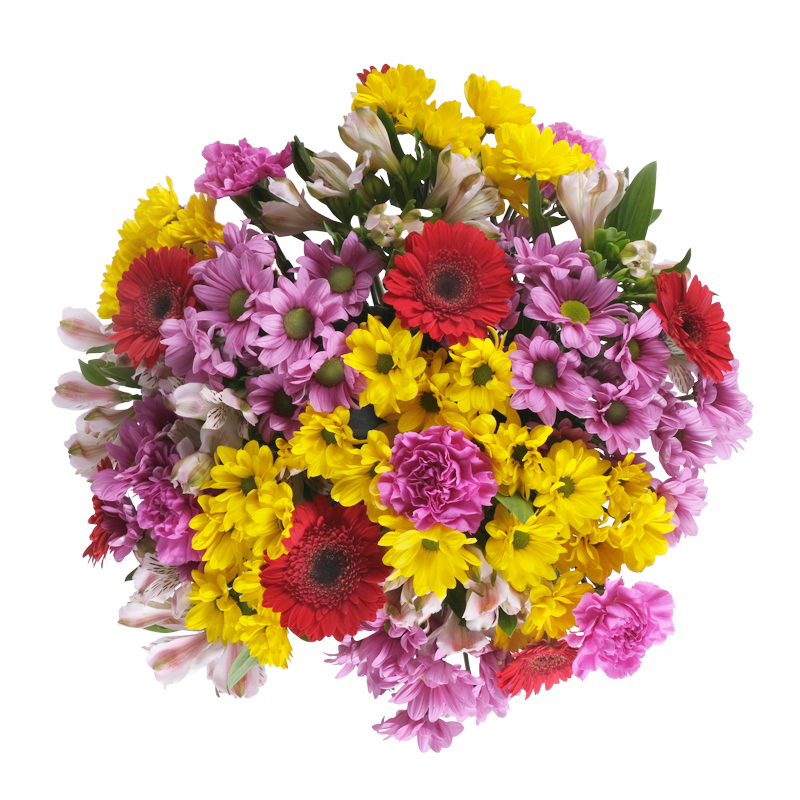Zawsze świeże kwiaty                                      Gerbery, santini, goździki i alstromerie układają się w dynamiczną kompozycję, która od razu przyciąga wzrok. Dzięki świeżości kwiatów i starannemu wykonaniu bukiet będzie cieszył przez wiele dni. Idealny dla kogoś, kto kocha życie w pełnych barwach i ceni sobie odrobinę szaleństwa.
